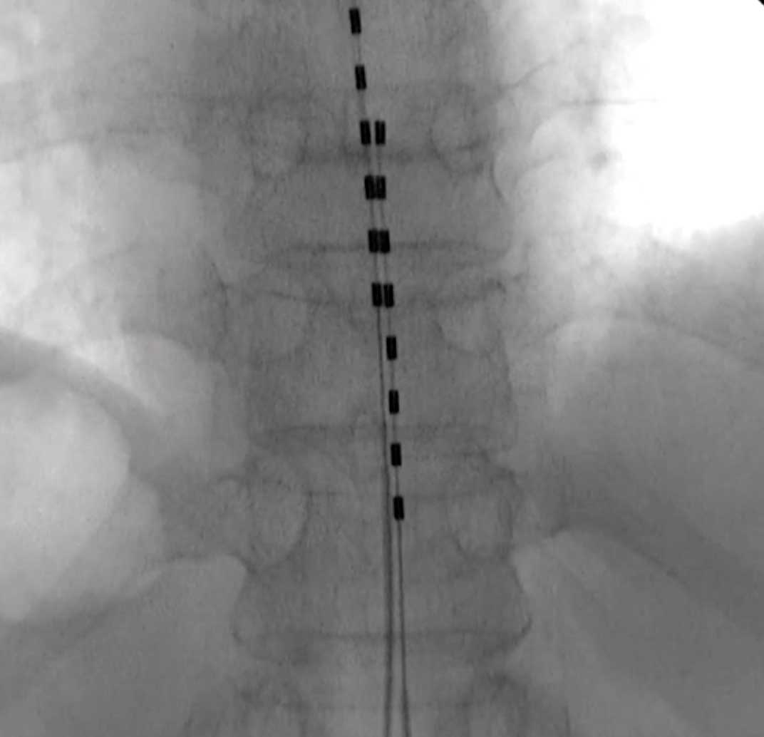 - 背中の真ん中に2-3cmの傷をつくり、脊髄刺激のための細いリードを1-2本、脊髄の外側にある硬膜外腔というところに留置します。
