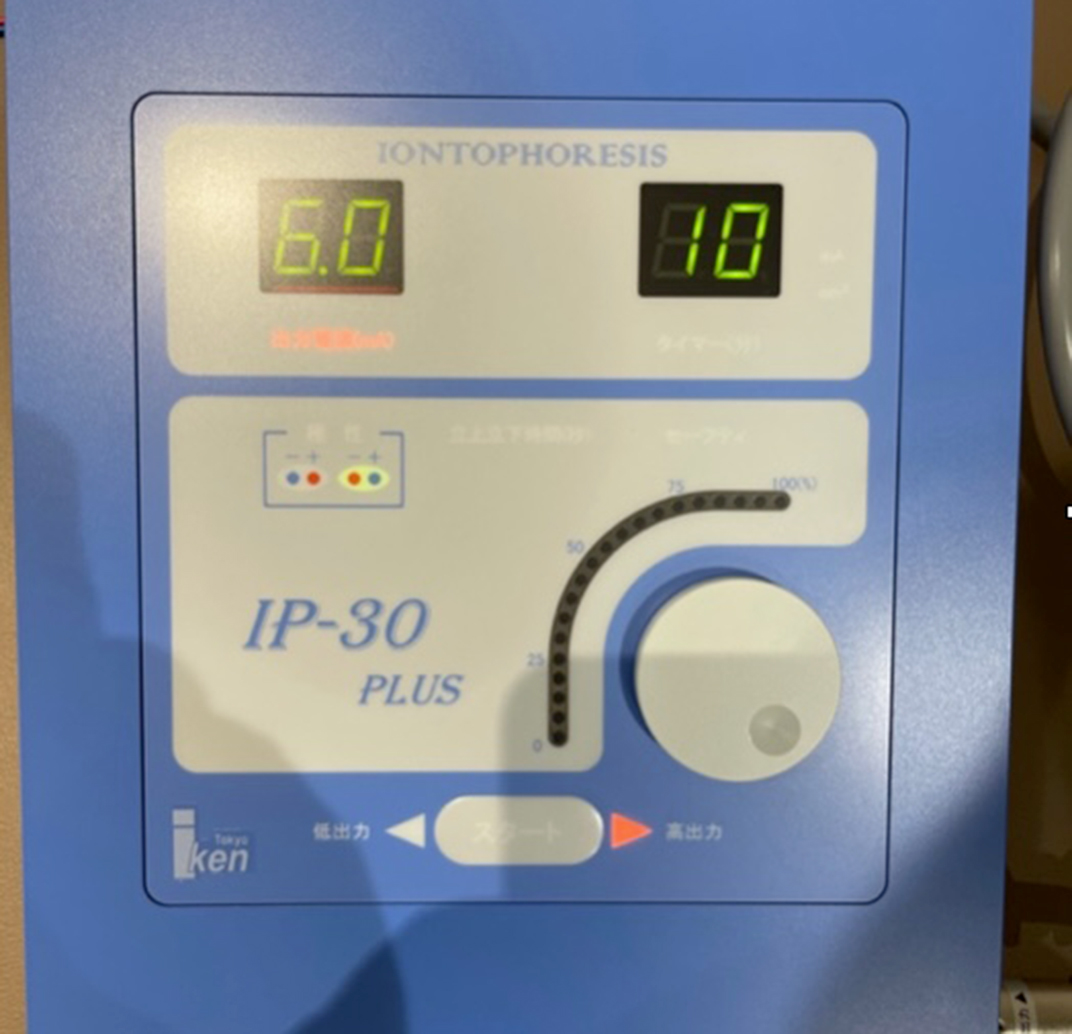 多汗症治療は主な発汗部位に応じて、治療法が異なります。顔面・頭部では薬物療法や星状神経節ブロック、腋窩多汗症ではエクロックゲルという塗り薬、手掌多汗症ではイオントフォレーゼという微弱な電流を流す治療が可能です。特にイオントフォレーゼはガイドライン上でもその有効性が示されており、当院では厚生労働省承認機であるイオントフォレーシス(東京医研 IP30Plus)を用いて施行しております。微弱な電流を流すことで水を電気分解し、生じた水素イオンが汗を作る汗腺細胞をブロックすることで発汗を抑制する機序です。繰り返しての通院は必要ですが保険適応の治療となっております。