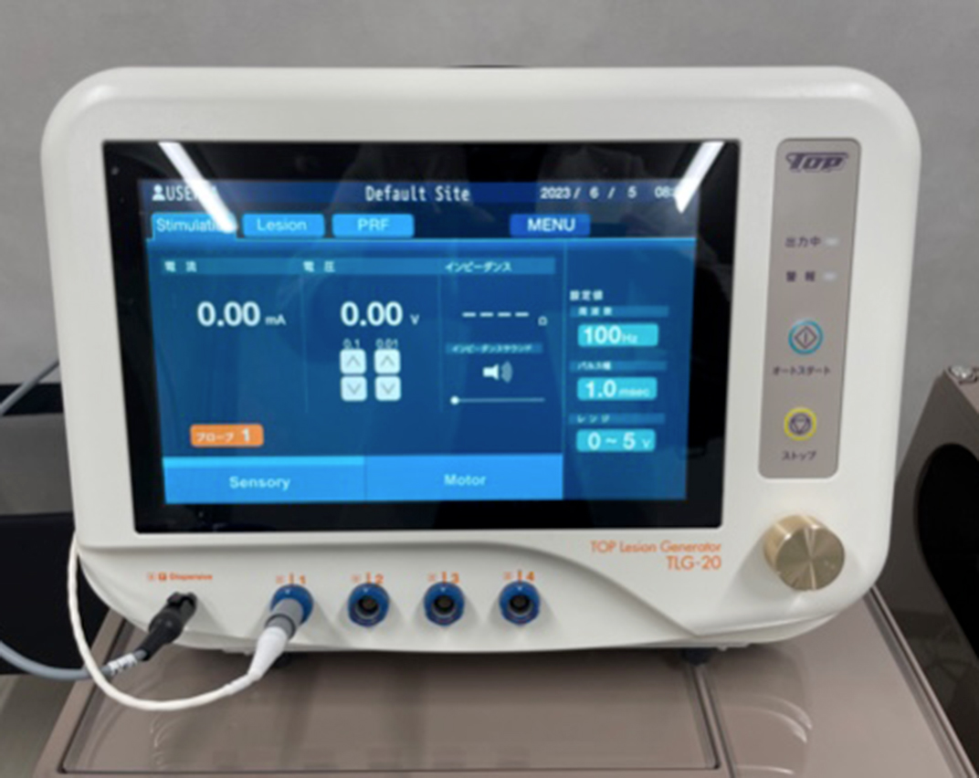 当院では通常の神経ブロックに加え、リージョンジェネレーター(トップ TLG-20)を使用した高周波熱凝固法・パルス高周波法を導入しています。針の先端の温度を変化させることができる特殊な神経ブロック針を用いて行います。薬剤のみの神経ブロックに比べ効果が長期間持続することがこれらの方法の利点です。高周波熱凝固法にするのか、パルス熱凝固法にするのかは施行する神経の部位によって変わります。