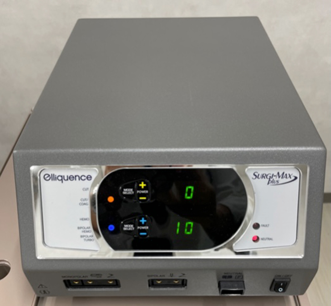 経皮的な椎間板ヘルニア治療法には従来からレーザー椎間板減圧術(PLDD法)がありました。本法はさらに中等度までのヘルニアが治療の適応となり、椎間板性の頸部痛・腰痛に特に有効な、皮膚を切らずにおこなえる治療です。小鉗子で機械的に少量の髄核を摘出し、さらにラジオ波で蒸散させ、線維輪損傷部を凝縮し、以後のヘルニア進行をくい止めます。軽度〜中等度ヘルニアに有効な日帰り手術です。エリクエンス社のサージマックスという機器を用いて行います。
