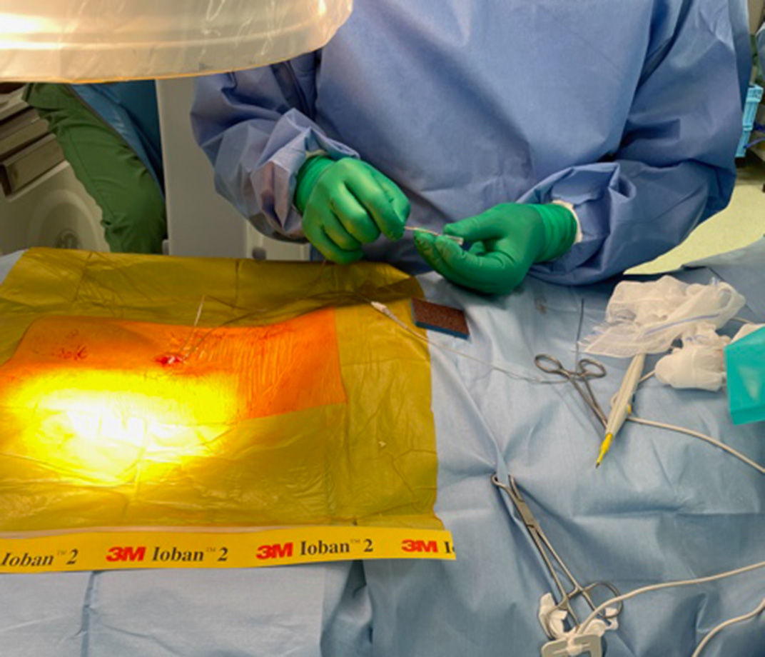 手術中の様子 - リードの端をジェネレーター(ペースメーカーのような刺激装置)につなげます。